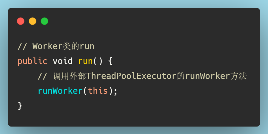 在Worker的run方法中直接调用外部类ThreadPoolExecutor的runWorker(Worker)方法。