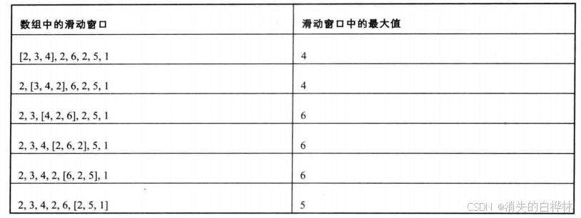 第二个数字是3,比2大,所以2不可能是滑动窗口中的最大值,因此把2从队列里删除,再把3存入队列中。第三个数字是4,比3大,同样的删3存4。例如,如果输入数组{2,3,4,2,6,2,5,1}及滑动窗口的大小3,那么一共存在6个滑动窗口,他们的最大值分别为{4,4,6,6,6,5}。当一个数字的下标与当前处理的数字的下标之差大于或者相等于滑动窗口大小时,这个数字已经从窗口中滑出,可以从队列中删除。我们可以用STL中的deque来实现,接下来我们以数组{2,3,4,2,6,2,5,1}为例,来细说整体思路。