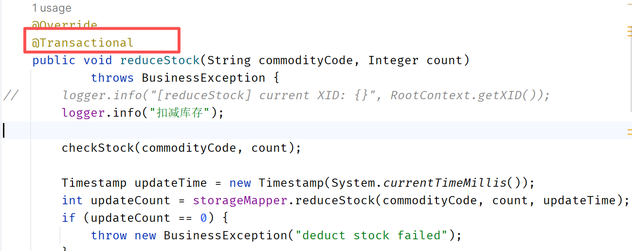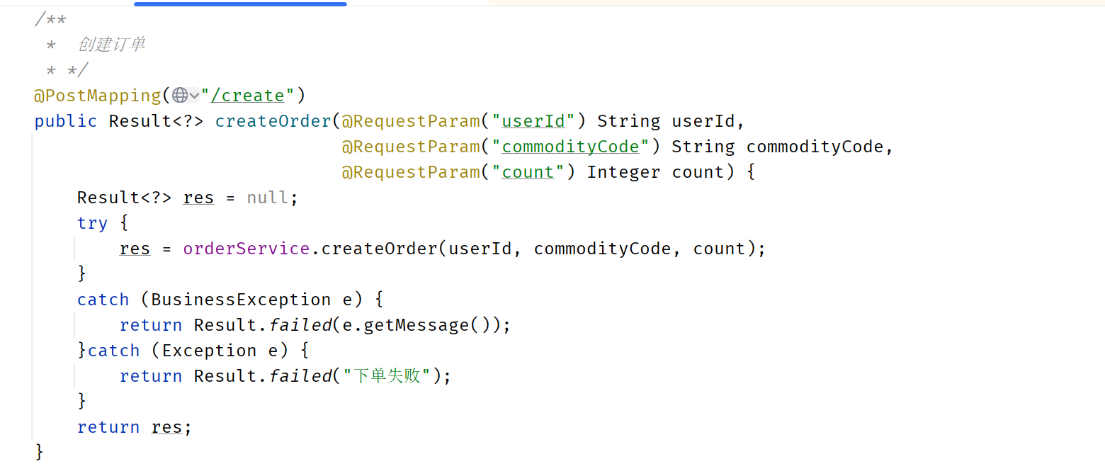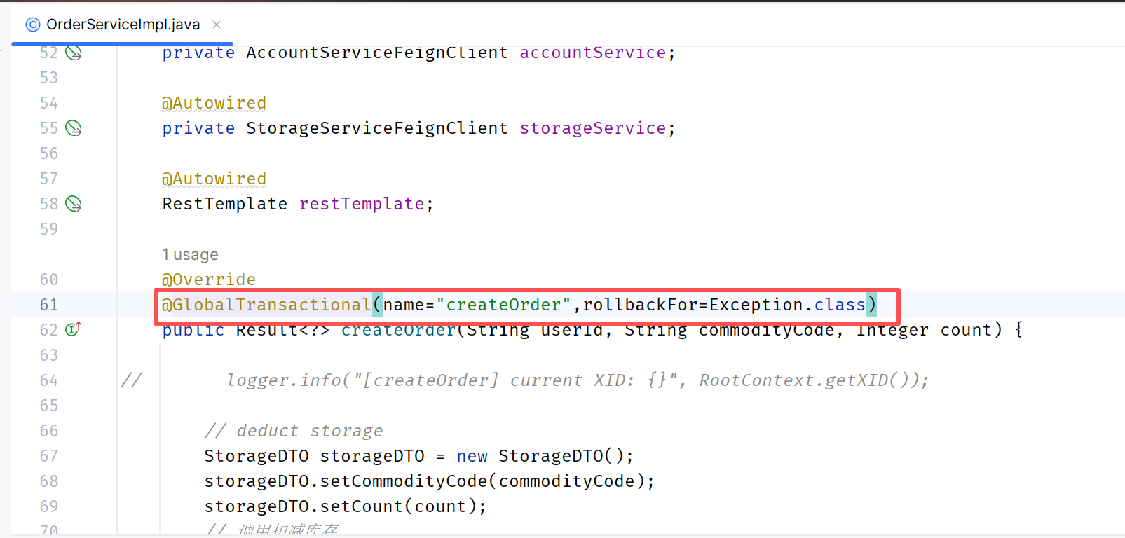 在订单服务(全局事务发起者)的createOrder方法上面添加注解