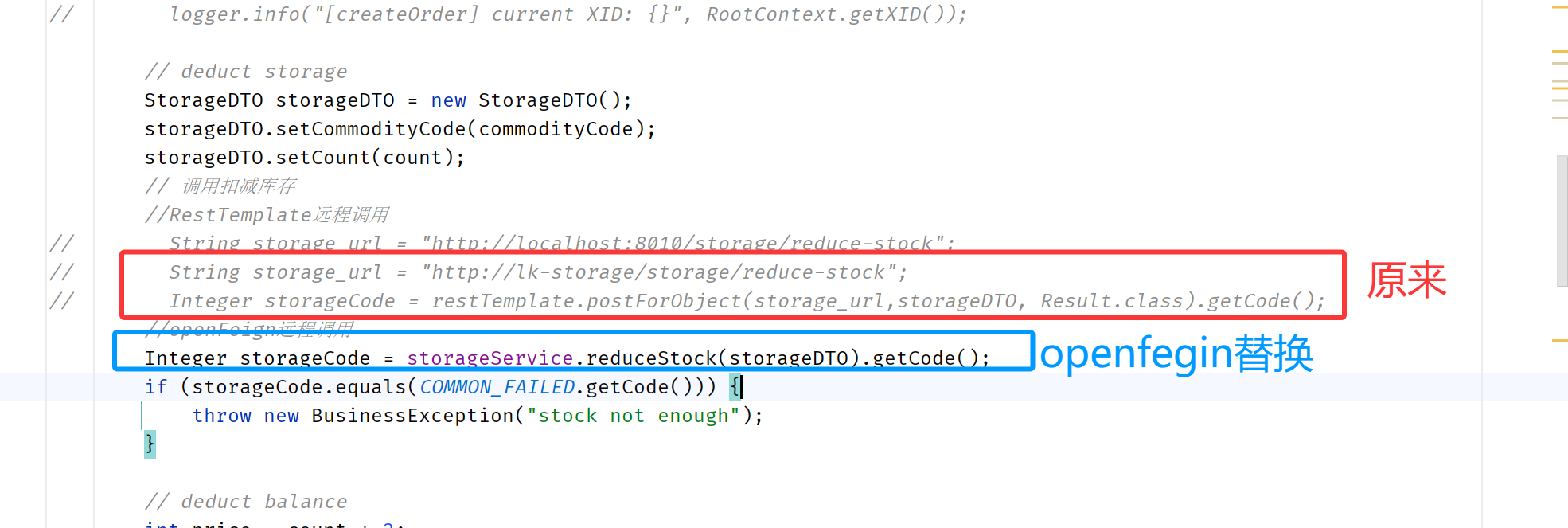 OrderServiceImpl下的createOrder方法中调用库存和余额的服务ip地址用注册在nacos中的服务名称来代替