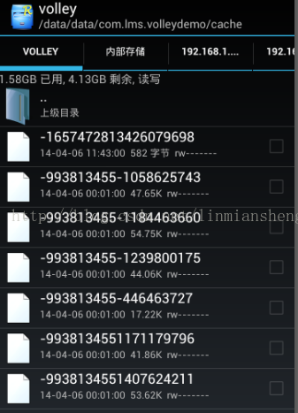 在前面的VolleyDemo中,我们加载了一些图片,也加载了一些json数据,那么我们现在就来看看在缓存中的数据,有没有缓存图片的数据,同时,有没有缓存json的数据。