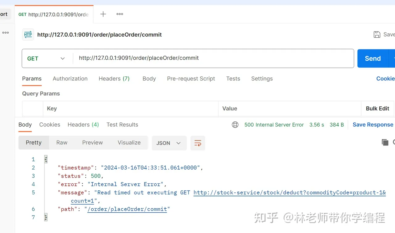 利用postman来执行order/placeOrder/commit接口,可以看到返回值是500,如下所示: