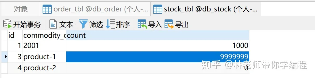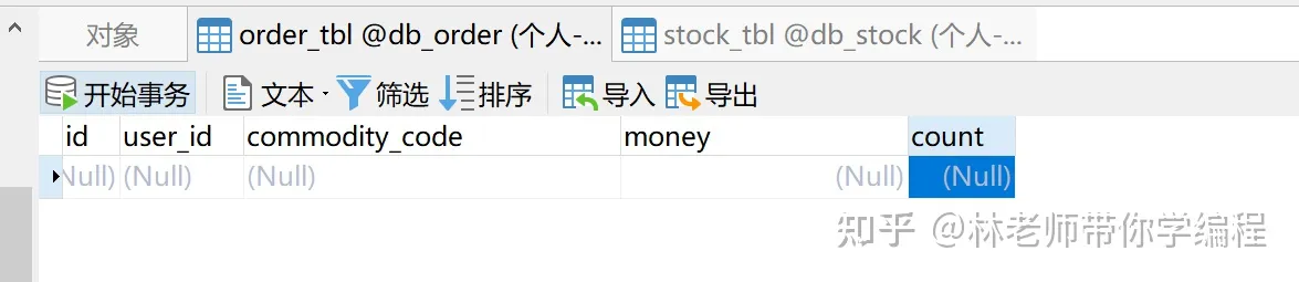 执行接口后,我们重新刷新一下stock_tbl和order_tbl表,发现库表数据没有发生任何变动,说明分布式事务生效了,stock_tbl和order_tbl的数据都成功回滚了。