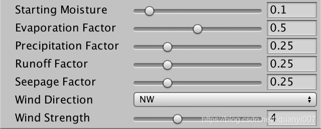 首先让我们在模拟中添加一个主导风向。虽然主导风向在地球上变化很大,但我们将使用一个可配置的全球风向。让我们使用西北风作为默认值。除此之外,还可以配置此风的强度,从1到10,默认值为4。