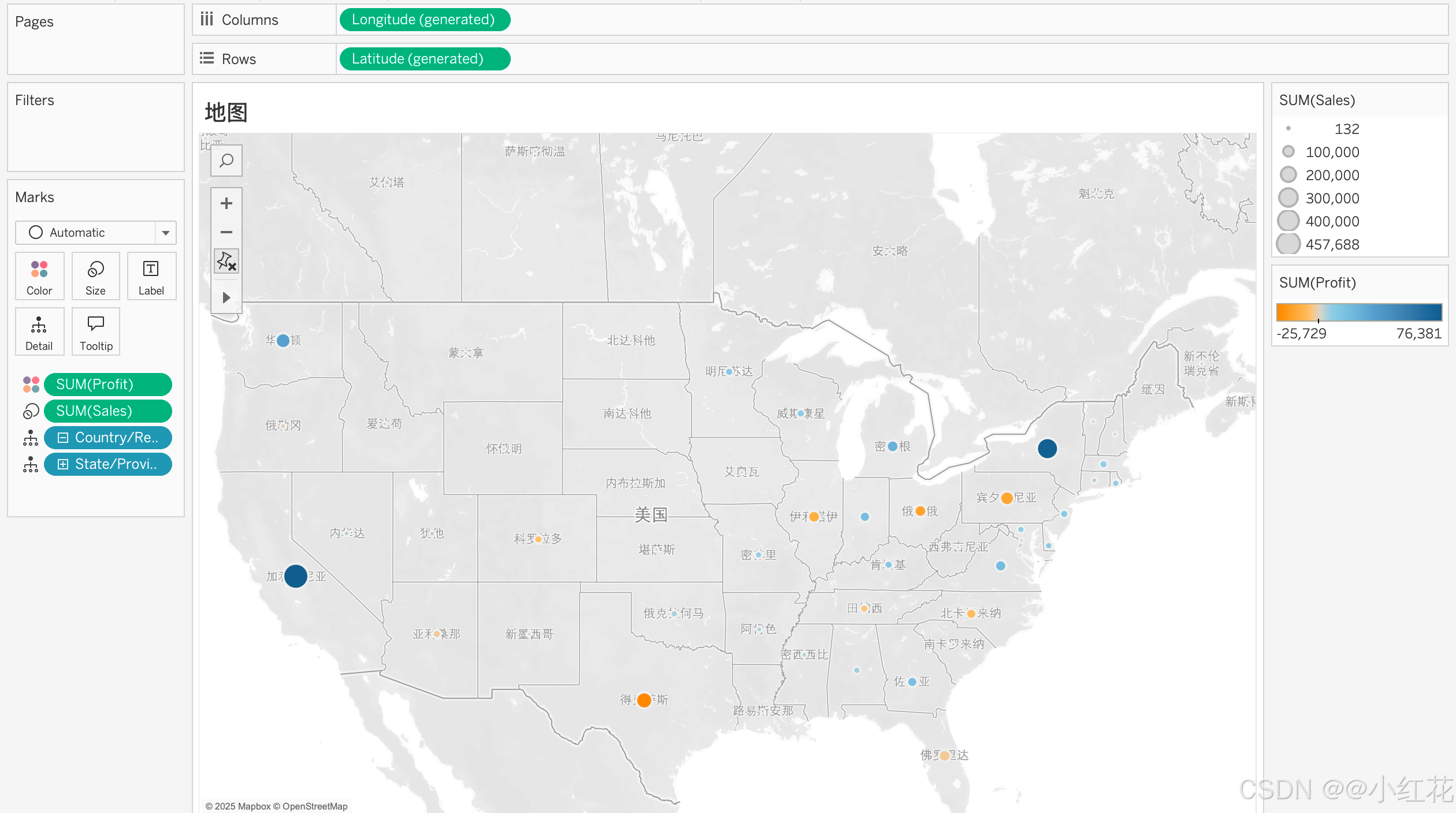 将 Sales 拖到 Size,Profit 拖到 Color。