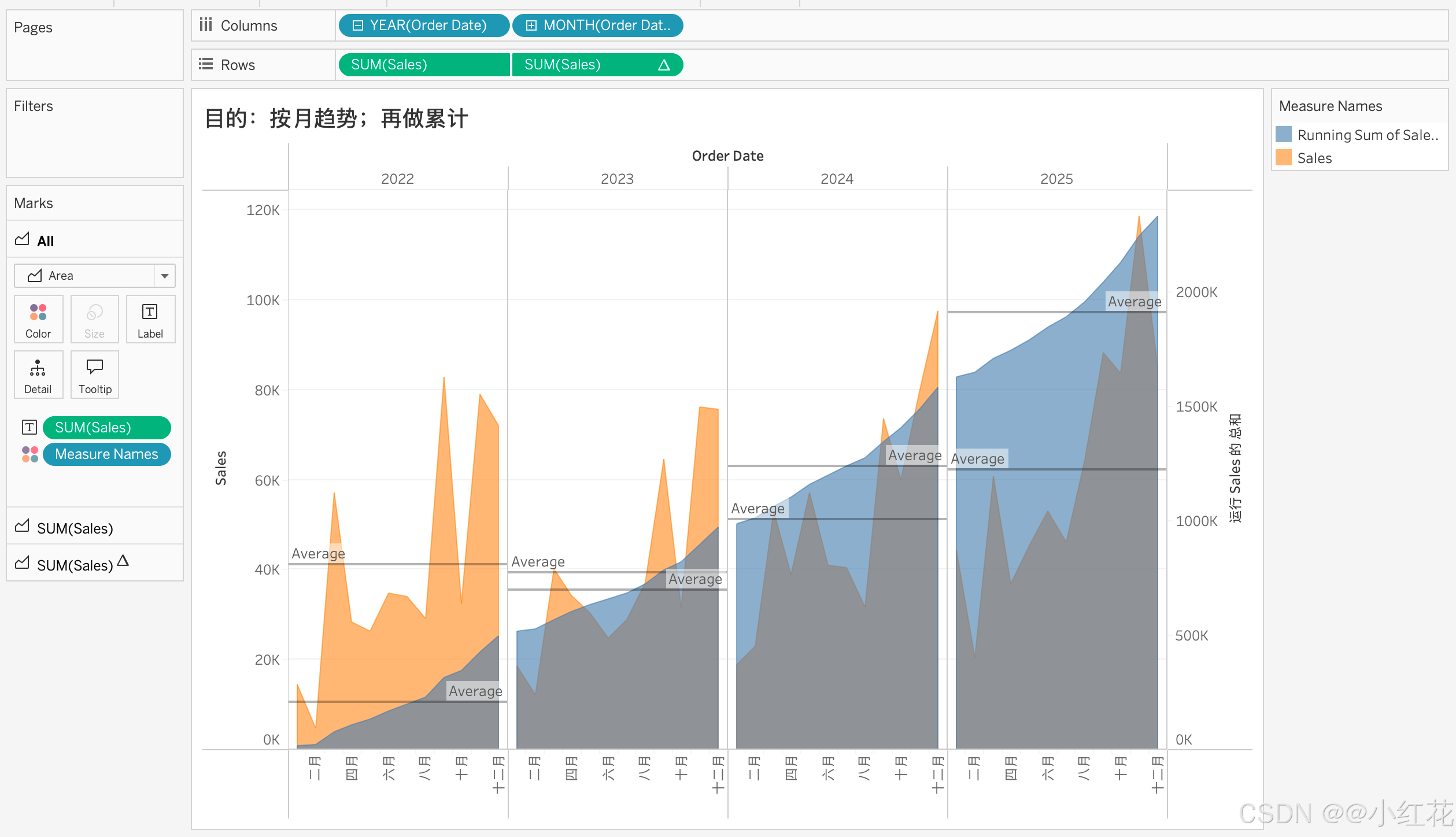 若要显示两条(当期与累计):将 SUM(Sales) 复制到 Rows 形成两条轴,一条保持原值,一条设 Running Total,再 Dual Axis(双轴)并 Synchronize Axis。