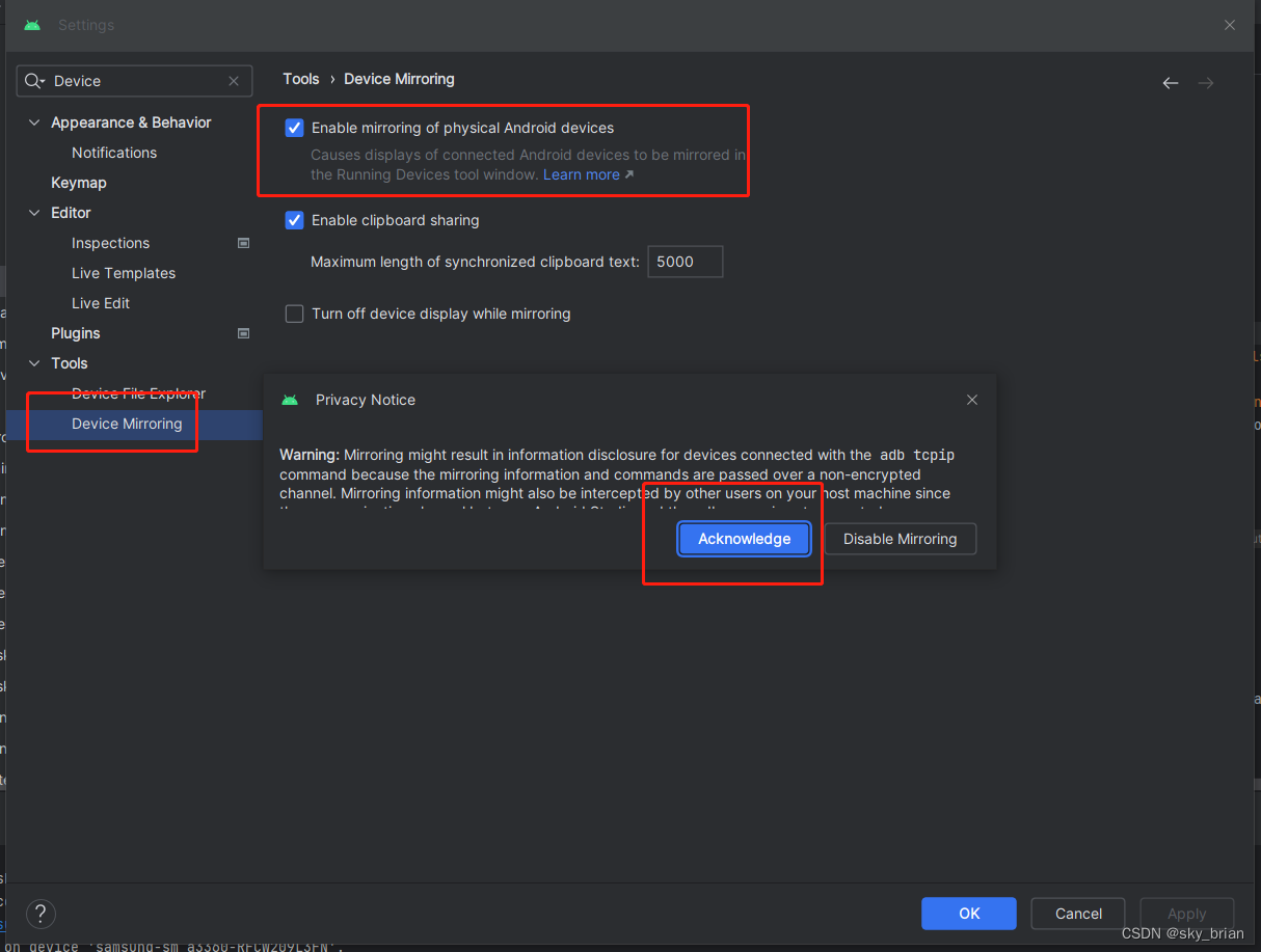 打开步骤为:Settings->Tools->Device Mirroring->Enable mirroring of physical Android devices.