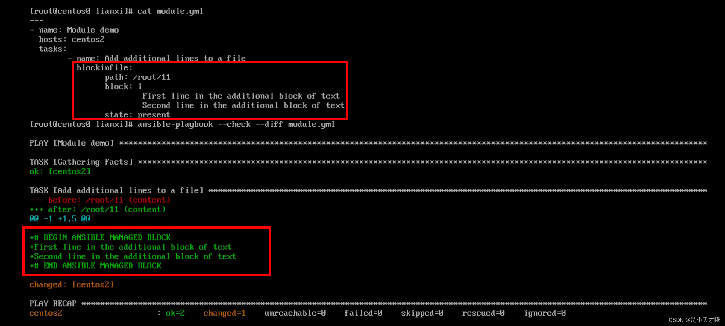 看到第二个红色括号,这里会显示对 centos2追上 /root/11文件的更改,但实际上并没有更改,我们来查看一下。