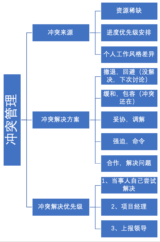 - 冲突管理。相关方就目标、成功标准、高层级需求、项目描述、总体里程碑和其他内容达成一致意见。