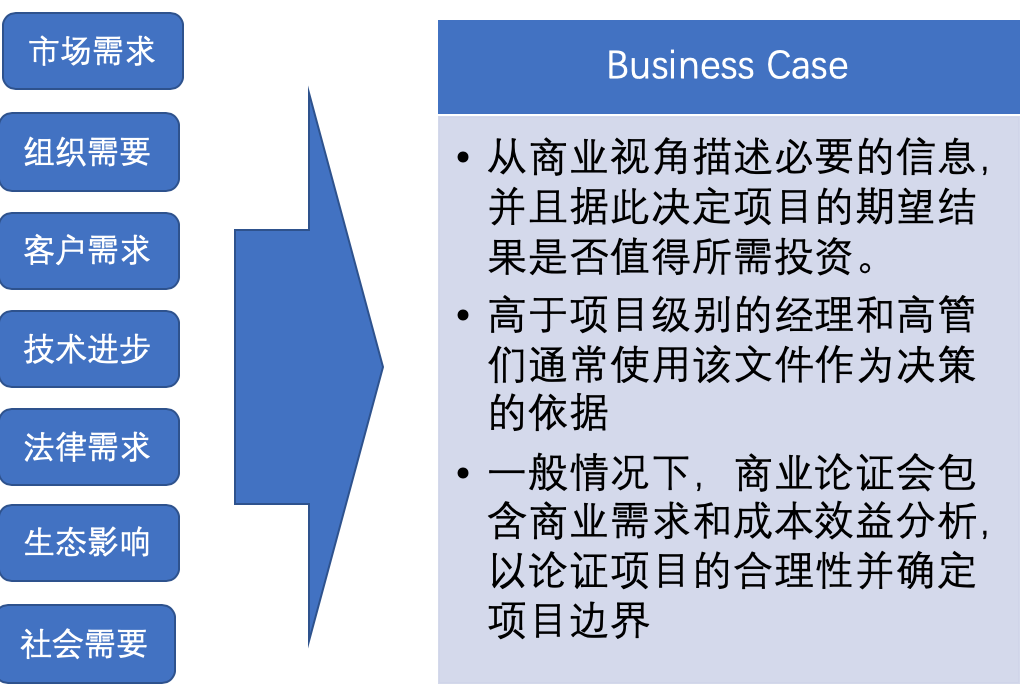 商业论证:商业论证是文档化的可行性研究报告,用来对尚缺乏充分定义的所选方案的收益进行有效性论证,是启动后续项目管理活动的依据。