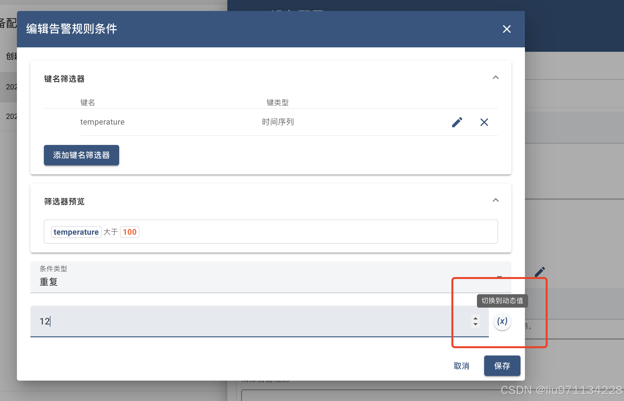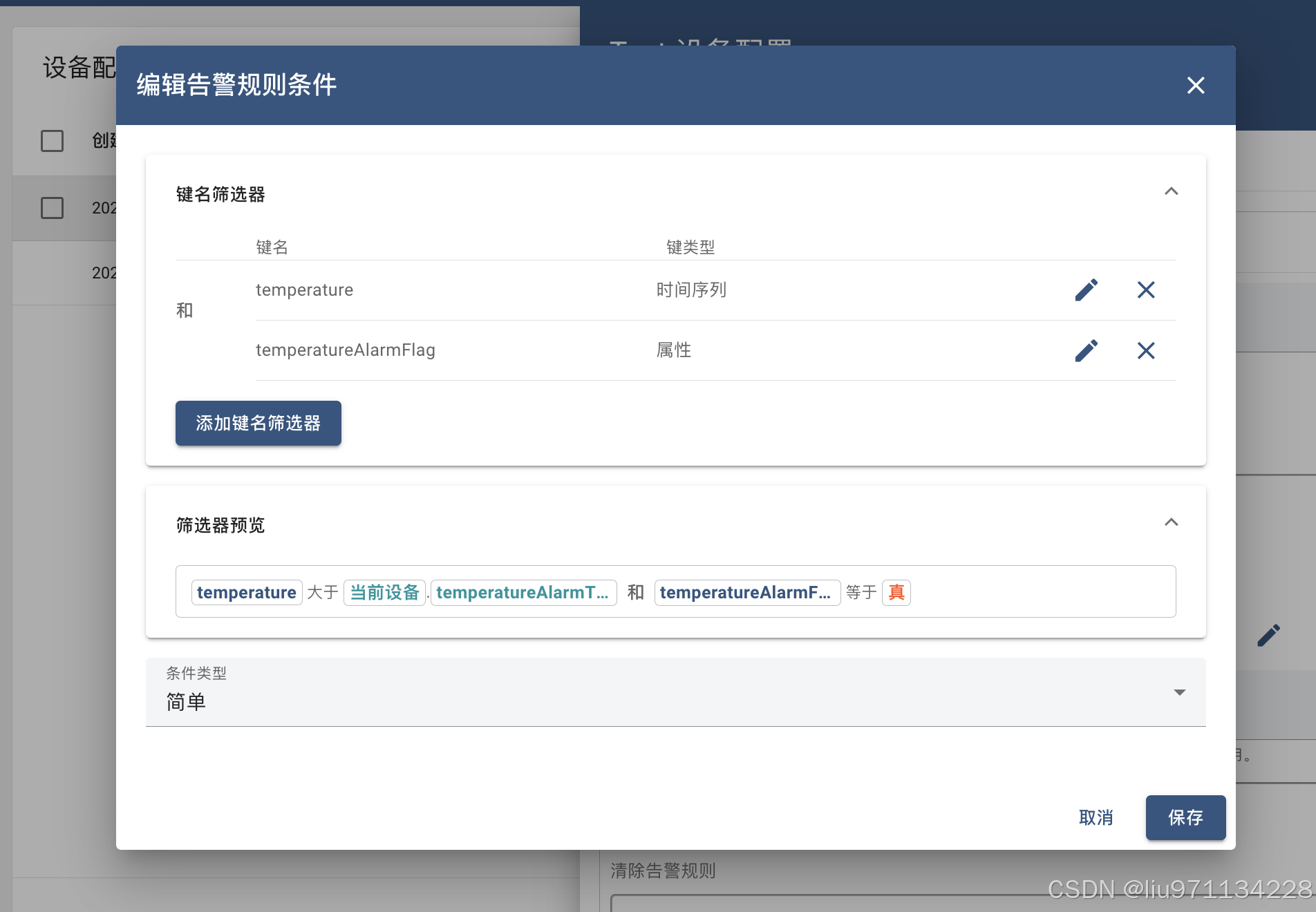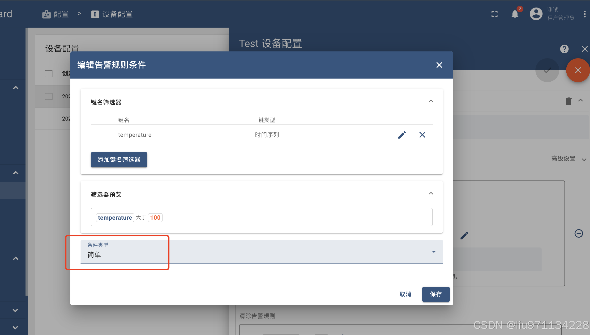 如何根据设备的“temperatureAlarmFlag”属性值启用或禁用规则,如果想为属于租户或客户的所有设备启用或禁用某些规则怎么办?为避免为每个设备配置属性可以配置警报规则以将常量值与租户或客户属性的值进行比较因此使用“常量”键类型并将其与动态值进行比较。