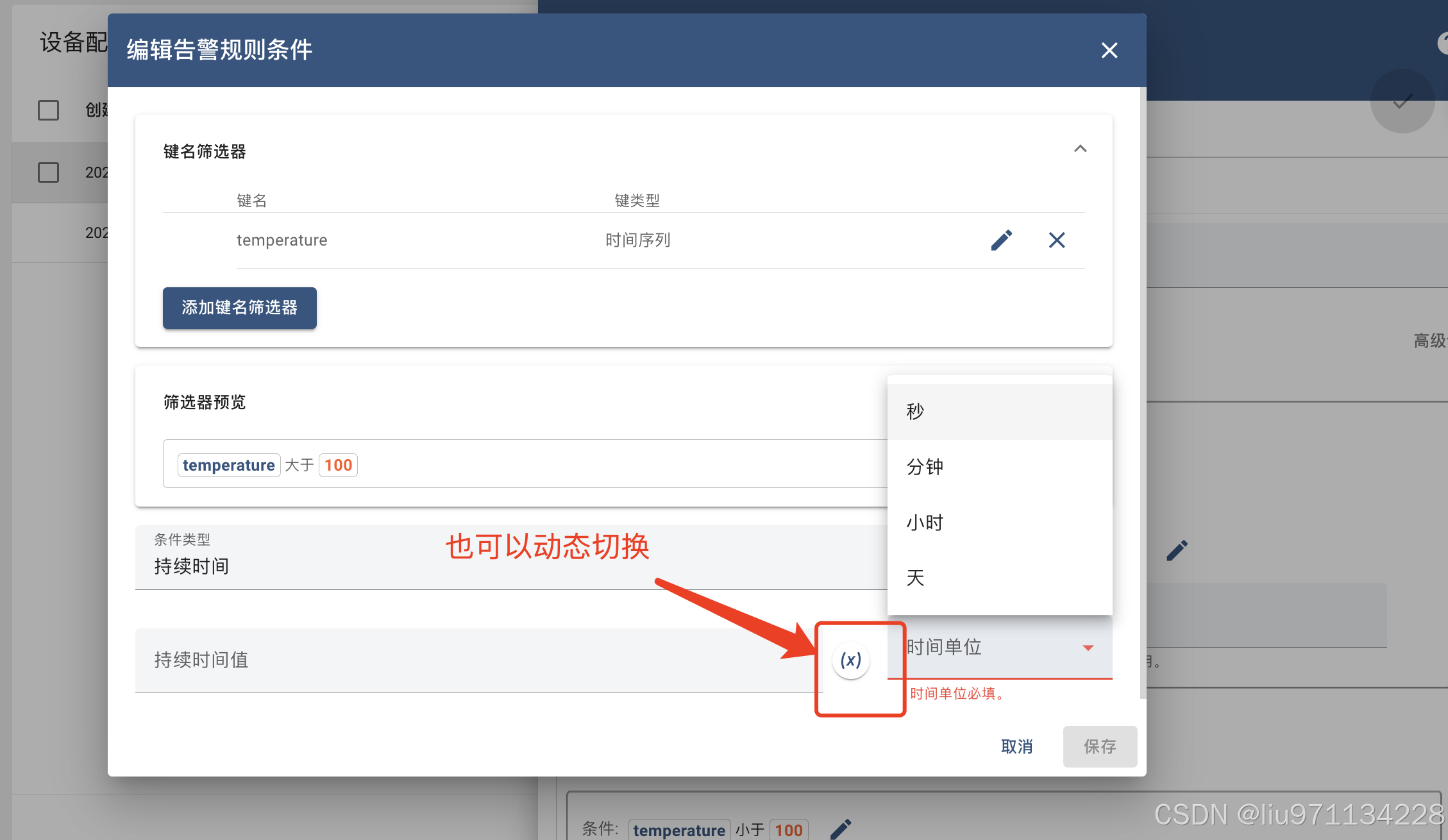 假设我们的用户能够从仪表板UI设置阈值并启用或禁用每个设备的某些警报,因为我们可以在警报规则中使用动态值进行匹配通过布尔值temperatureAlarmFlag和数字temperatureAlarmThreshold两个属性进行控制,然后匹配条件则是”temperatureAlarmFlag = True AND temperature is greater than temperatureAlarmThreshold“同步满足是产生警报。