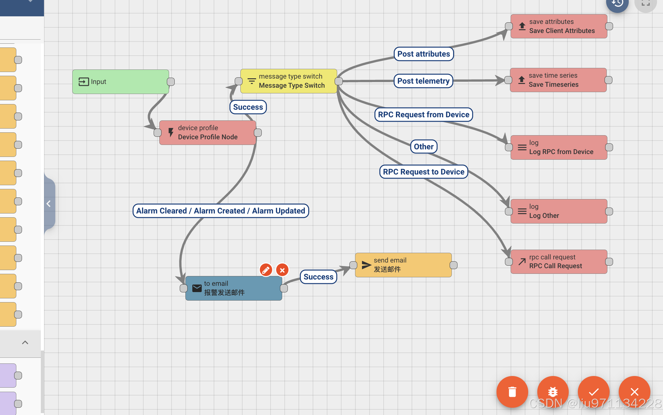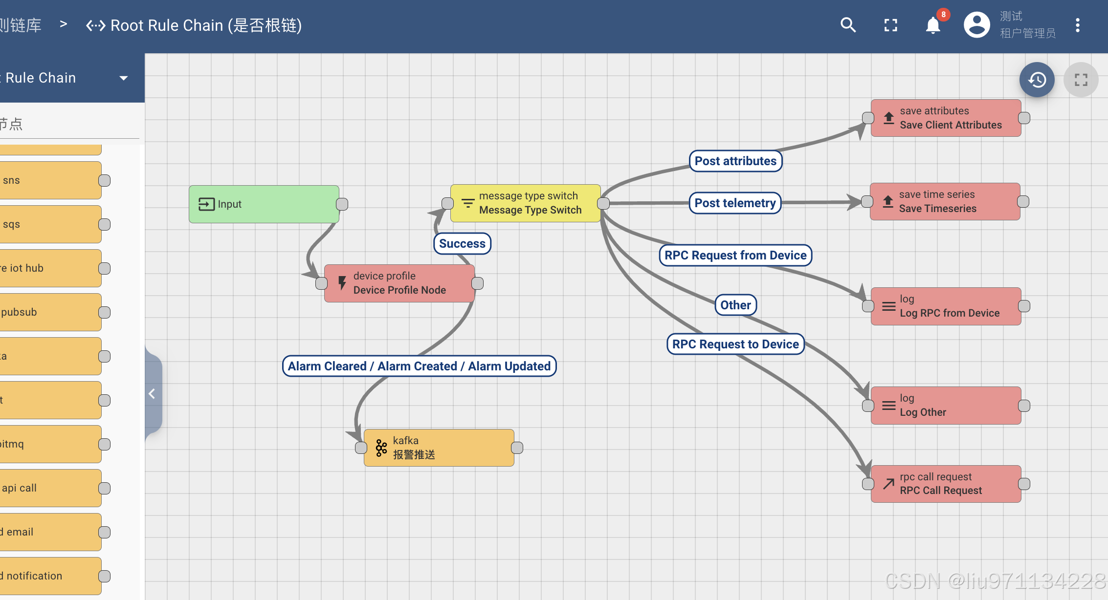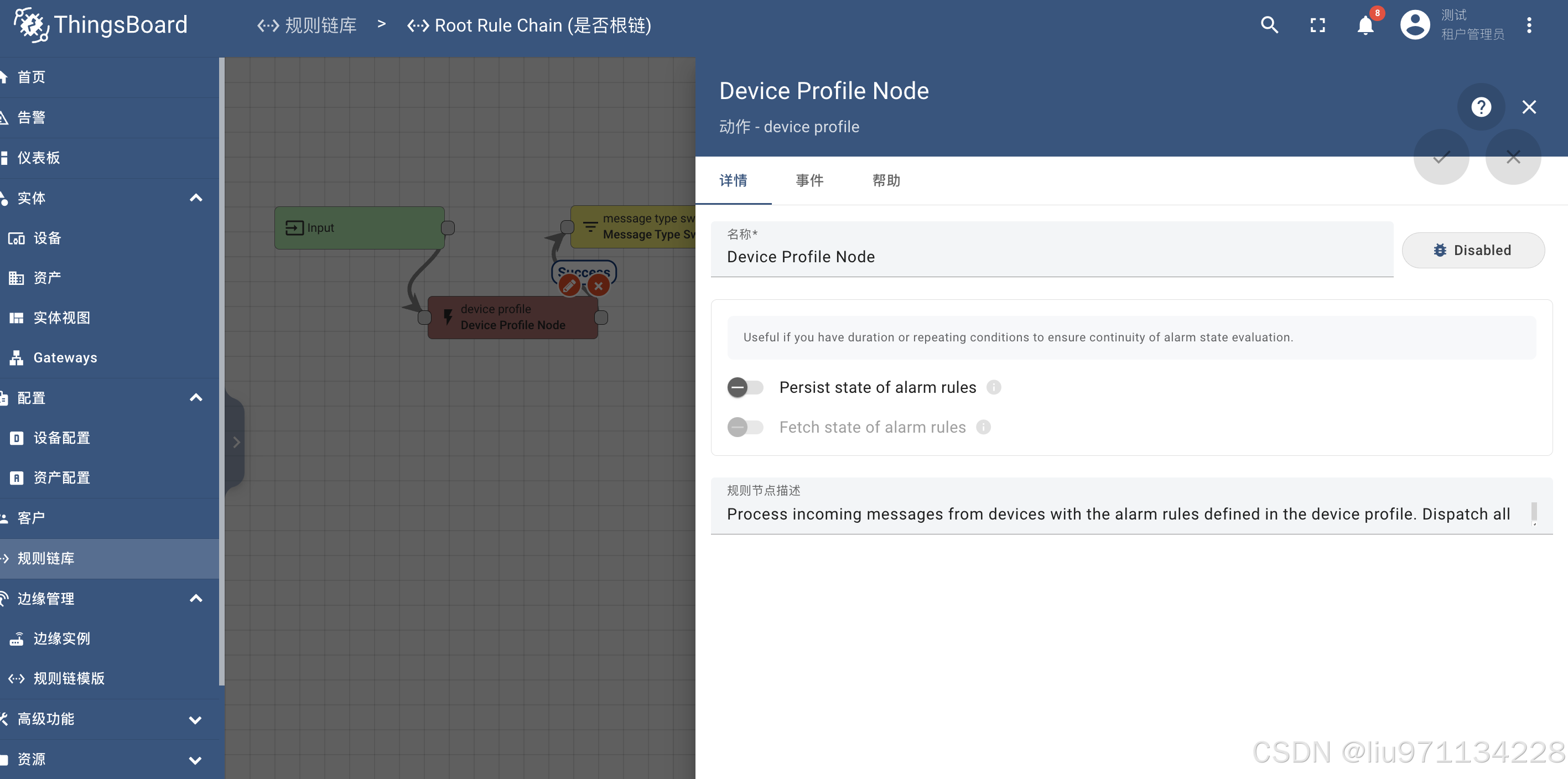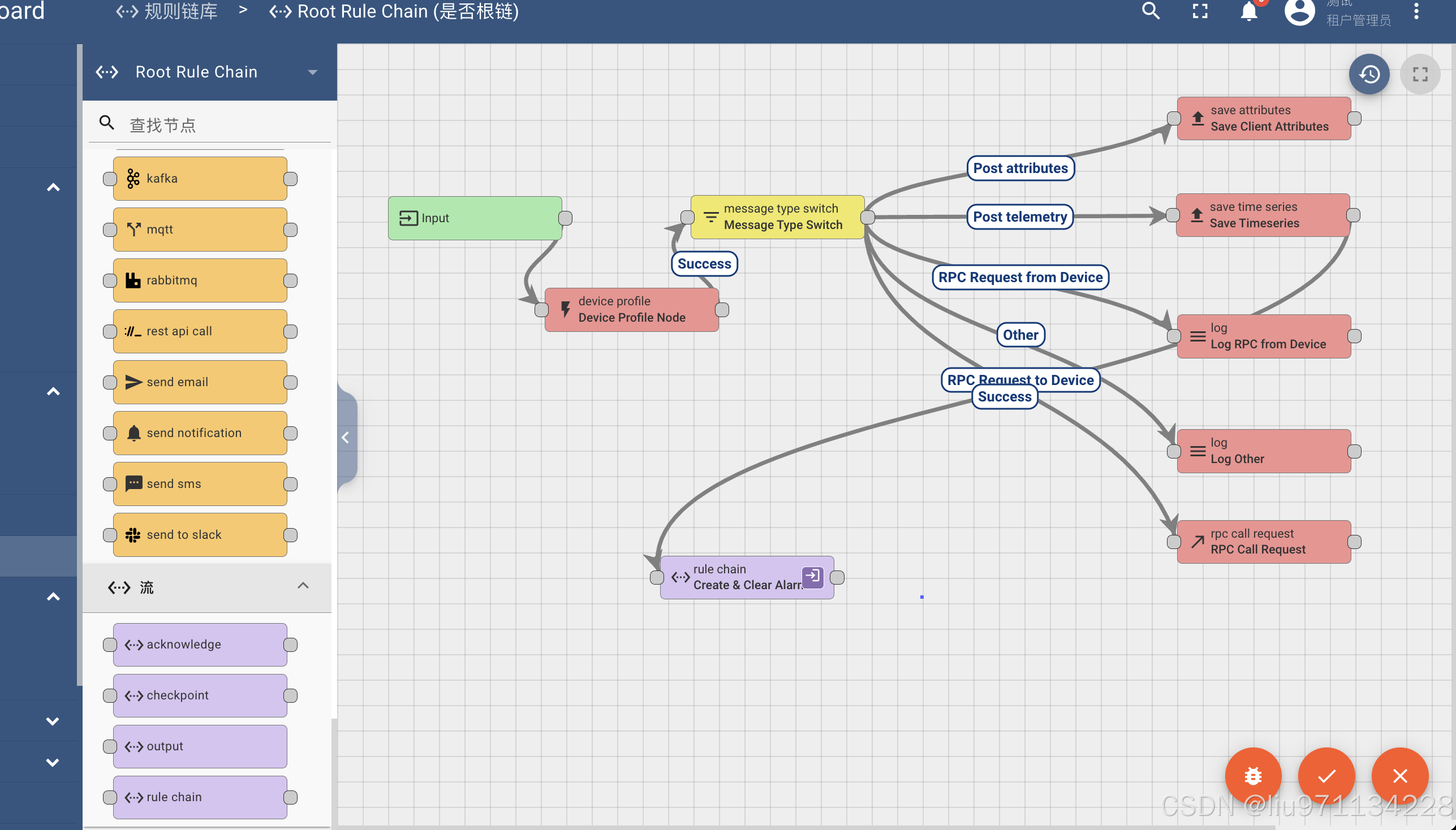 设备配置规则节点根据设备配置中定义的警报规则创建和清除警报。 默认情况下这是处理链中的第一个规则节点并对所有输入消息的属性和遥测值做处理。
