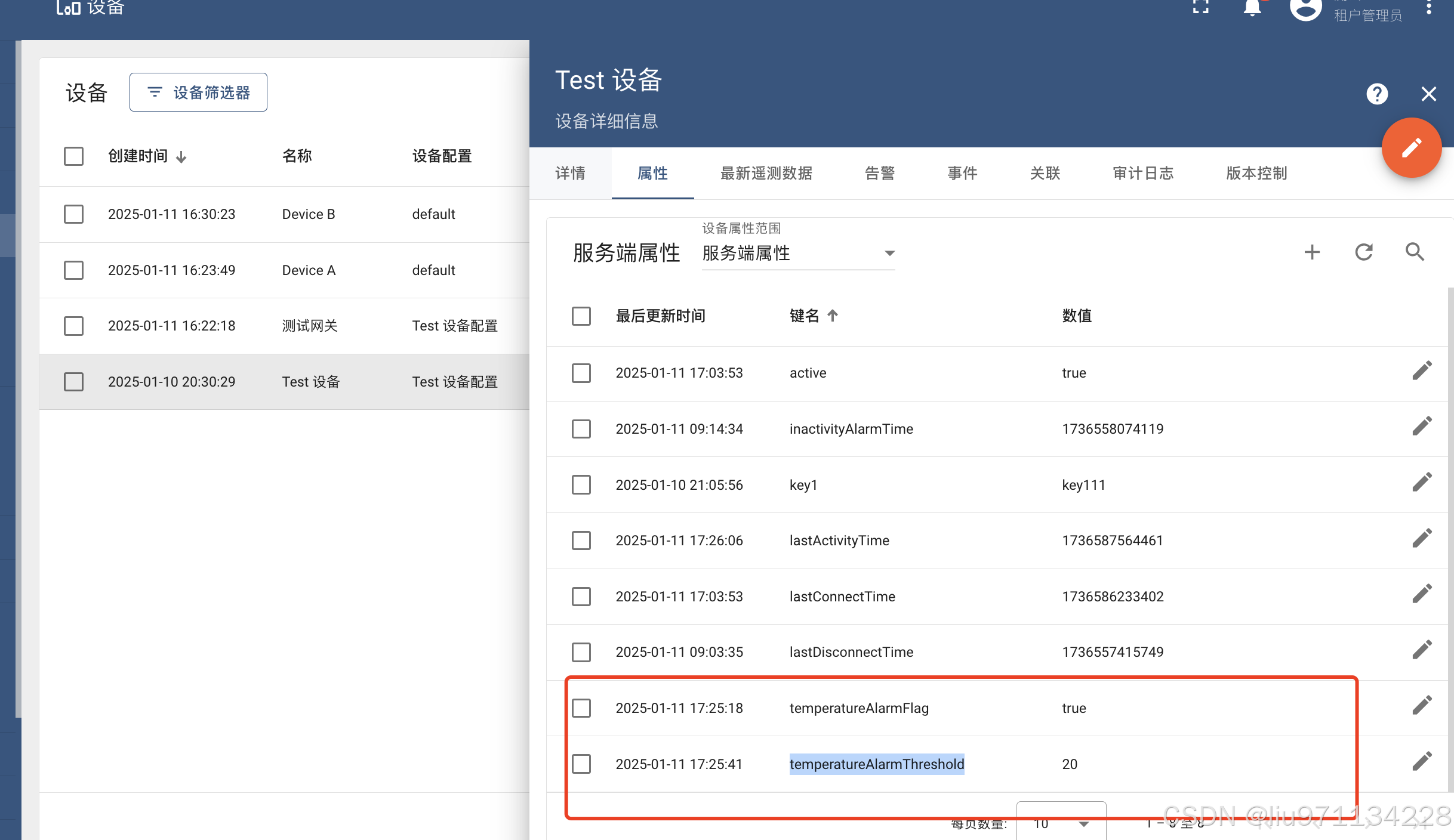 请为设备创建一个服务器端属性“highTemperatureDurationThreshold” 其整数值是 “1”。