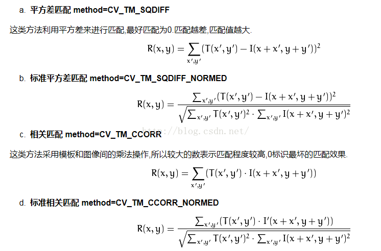 cvMatchTemplate函数实现的模板匹配,此函数也可自己实现,楼主自己做了一种匹配方法准确度还有待提升,所以在此还是用的opencv的函数,下面先对这个函数做个说明: