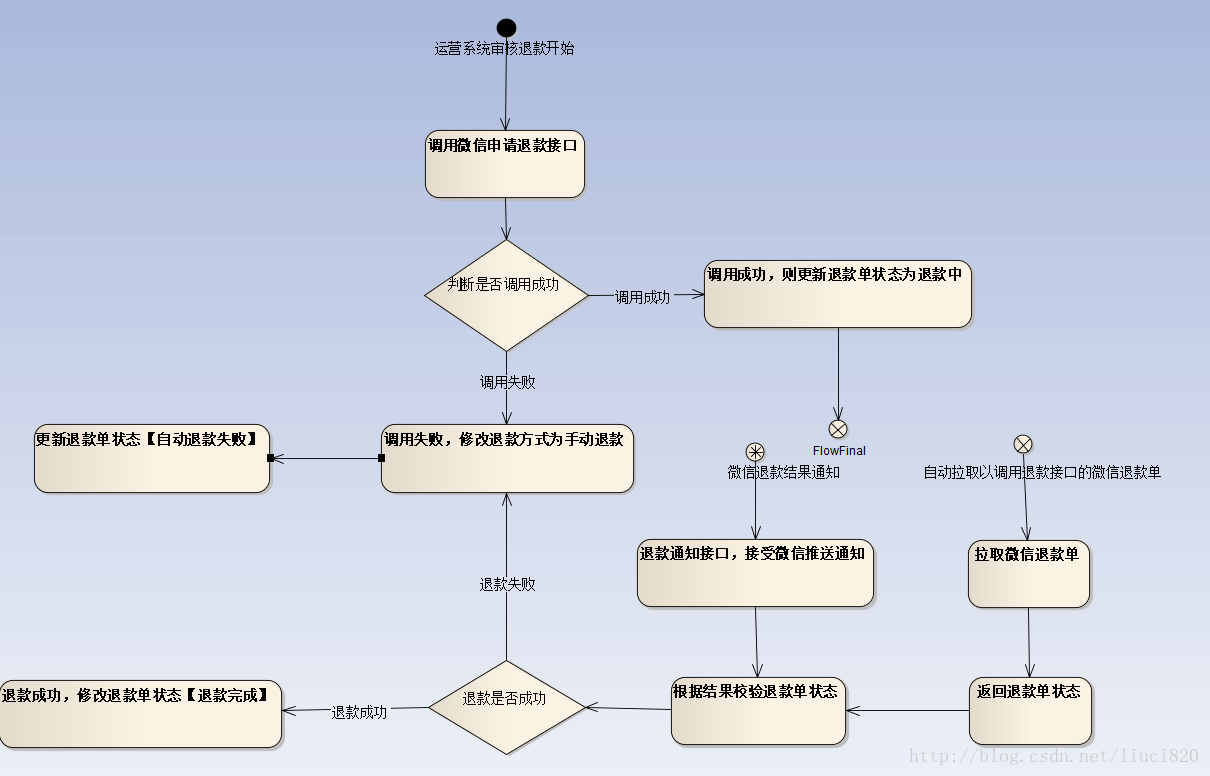 由于微信申请退款接口接受请求后不会立即进行退款处理,微信此处有延迟,因此在实际业务串接中,不能依据申请退款接口调用是否成功来修改业务系统中退款单的状态;必须以微信退款通知的状态或者自行调用查看退款状态接口的状态为准
