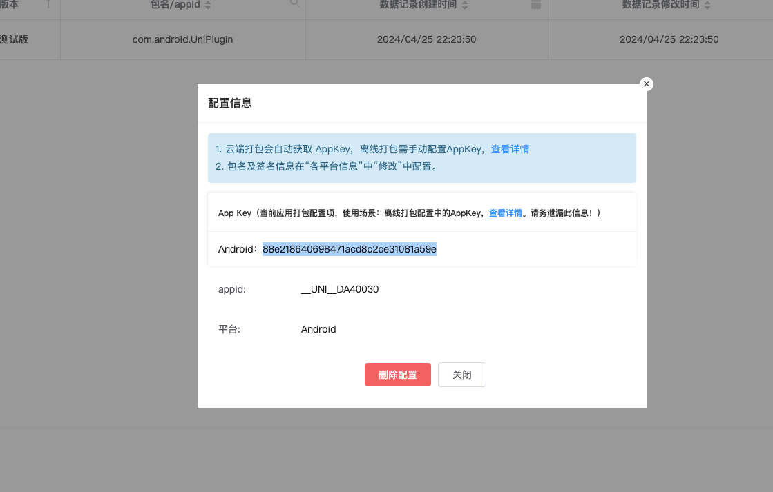- 点击应用名称进入应用,选择 离线打包Key管理 ,