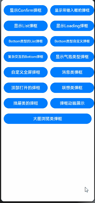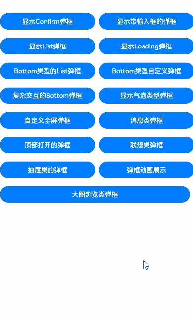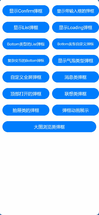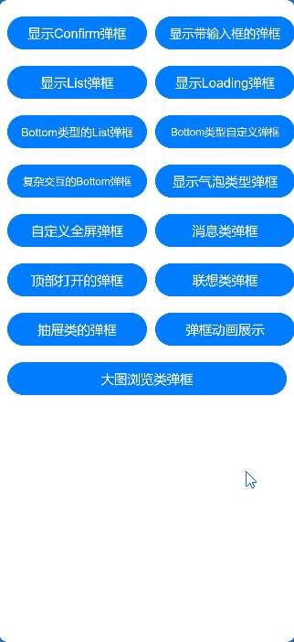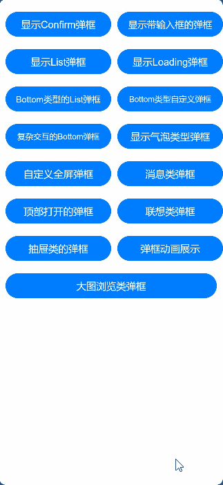 包括确认输入弹窗、列表展示选择弹窗、自定义底部/顶部弹窗、自定义动画弹窗、自定义全屏弹窗、消息类弹窗、抽屉类弹窗、联想类弹窗、图片浏览弹窗等。通过使用这个组件库,可以让弹窗的集成和使用变得更加简单。