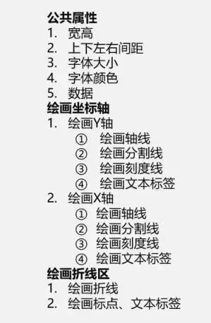 实现一个公共组件的时候,首先分析一下大概的实现结构以及开发思路,方便我们少走弯路,也可以使组件更加容易拓展,维护性更强。然后我会把功能逐个拆开来讲,这样大家才能学习到更详细的内容。下面简单阐述下折线图组件的功能结构: