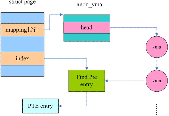 和file mapped类似,anonymous page也是通过VMA来寻找page frame对应的pte entry。由于文件映射页面的VMA数量可能非常大,因此我们采用Priority search tree这样的数据结构。对于匿名映射页面,其数量一般不会太大,所以使用链表结构就OK了。