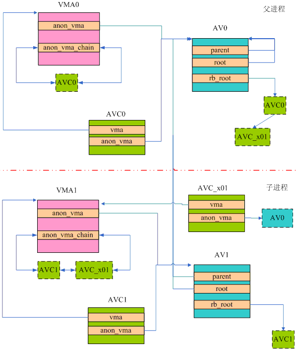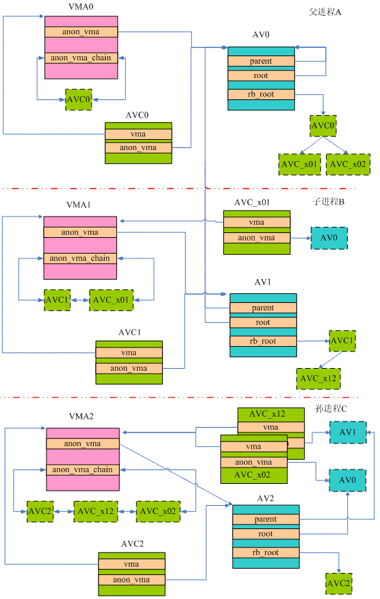 父进程也会创建其他新的子进程,新创建的子进程的层次和VMA1、VA1的类似,这里就不描述了。不过需要注意的是:父进程每创建一个子进程,AV0的红黑树中会增加每一个起“桥梁”作用的AVC,以此连接到子进程的VMA。