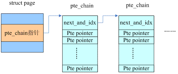 如何构建rmap?最直观的想法就是针对每一个page frame,我们维护一个链表,保存属于该page的所有PTEs。因此,Rik van Riel给struct page增加了一个pte chain的成员,以便把所有mapping到该page的pte entry指针给串起来。这样想要unmap一个page就易如反掌了,沿着这个pte chain就可以找到所有的mappings。一个基本的示意图如下,下面的小节会给出更详细的解释。