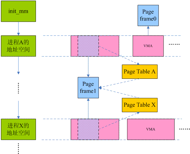 逆向映射相反,在已知page frame的情况下(可能是PFN、可能是指向page descriptor的指针,也可能是物理地址,内核有各种宏定义用于在它们之间进行转换),找到映射到该物理页面的虚拟页面们。由于一个page frame可以在多个进程之间共享,因此逆向映射的任务是把分散在各个进程地址空间中的所有的page table entry全部找出来。