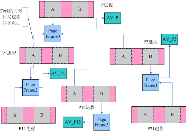 经过上面的这一些动作之后,我们来看看page frame共享的情况:对于P进程的page frame(是指该page 的mapping成员指向P进程的AV,即上图中的AV_P)而言,他可能会被任何一个level的的子进程VMA中的page所有共享,因此AV_P需要包括其子进程、孙进程……的所有的VMA。而对于P1进程而言,AV_P1则需要包括P1子进程、孙进程……的所有的VMA,有一点可以确认:至少父进程P和兄弟进程P2的VMA不需要包括在其中。