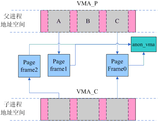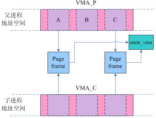 这时候由于写操作,父子进程原本共享的page frame已经不再共享,然而,这两个page却仍然指向同一个anon_vma,不仅如此,对于B这样的页面,一开始就没有在父子进程之间共享,当首次访问的时候(无论是父进程还是子进程),通过do_anonymous_page函数分配的page frame也是同样的指向一个anon_vma。也就是说,父子进程的VMA共享一个anon_vma。