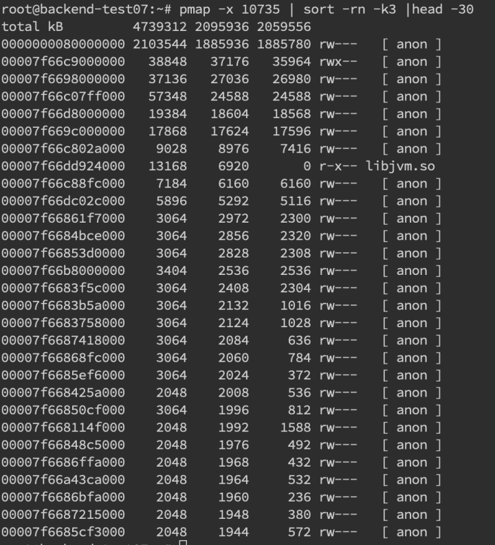 堆外内存溢出往往是和NIO的使用相关,一般我们先通过pmap来查看下进程占用的内存情况pmap -x pid | sort -rn -k3 | head -30,这段意思是查看对应pid倒序前30大的内存段。这边可以再一段时间后再跑一次命令看看内存增长情况,或者和正常机器比较可疑的内存段在哪里。