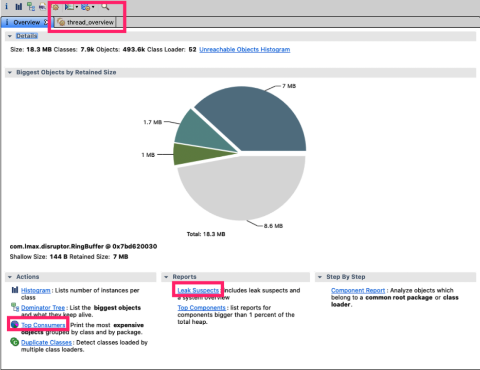 通过mat(Eclipse Memory Analysis Tools)导入dump文件进行分析,内存泄漏问题一般我们直接选Leak Suspects即可,mat给出了内存泄漏的建议。另外也可以选择Top Consumers来查看最大对象报告。和线程相关的问题可以选择thread overview进行分析。除此之外就是选择Histogram类概览来自己慢慢分析,大家可以搜搜mat的相关教程。
