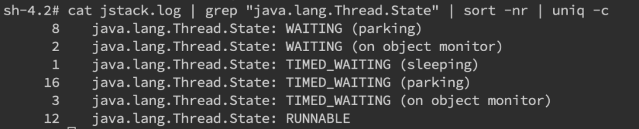 当然更常见的是我们对整个jstack文件进行分析,通常我们会比较关注WAITING和TIMED_WAITING的部分,BLOCKED就不用说了。我们可以使用命令cat jstack.log | grep "java.lang.Thread.State" | sort -nr | uniq -c来对jstack的状态有一个整体的把握,如果WAITING之类的特别多,那么多半是有问题啦。