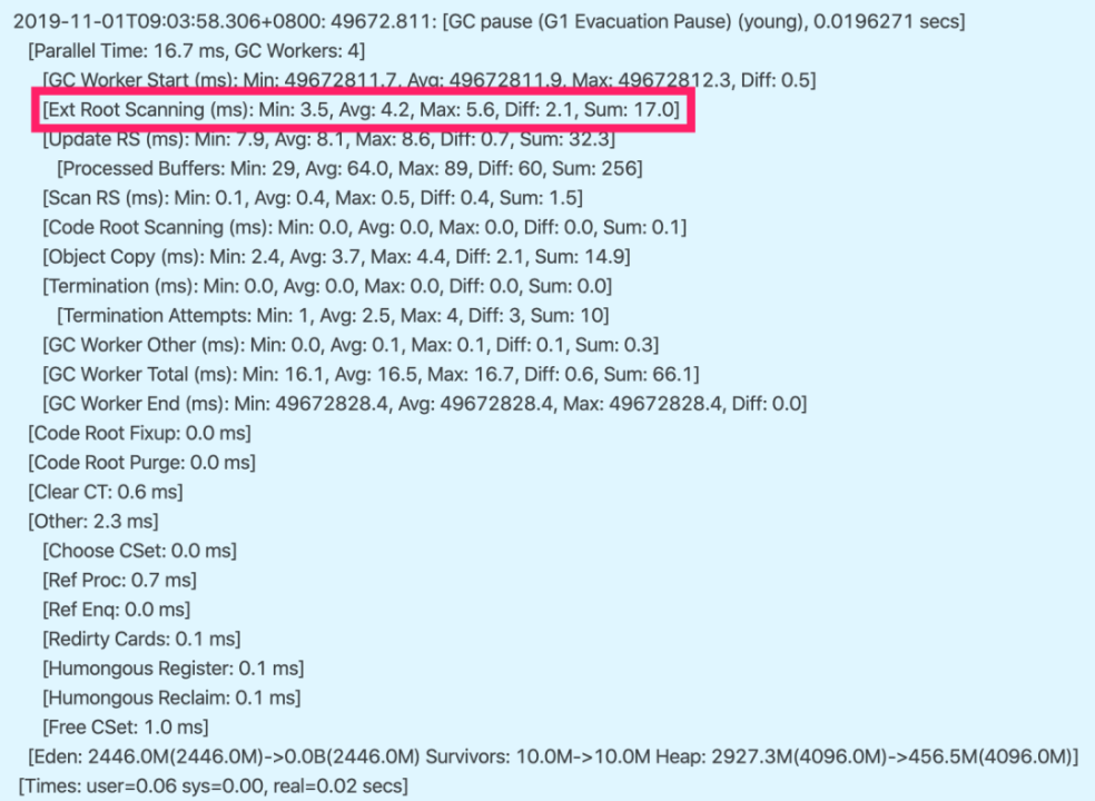 耗时过长问题就要看GC日志里耗时耗在哪一块了。以G1日志为例,可以关注Root Scanning、Object Copy、Ref Proc等阶段。Ref Proc耗时长,就要注意引用相关的对象。