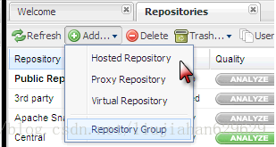 首次登陆nexus后可以看到以下一个仓库组和多个仓库。