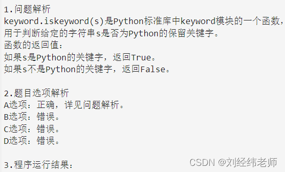 本文介绍了如何使用Python内置函数`keyword.iskeyword()`来判断给定字符串是否为Python保留关键字,并通过一个选择题的形式演示了该函数的用法,提供了解析和正确答案。