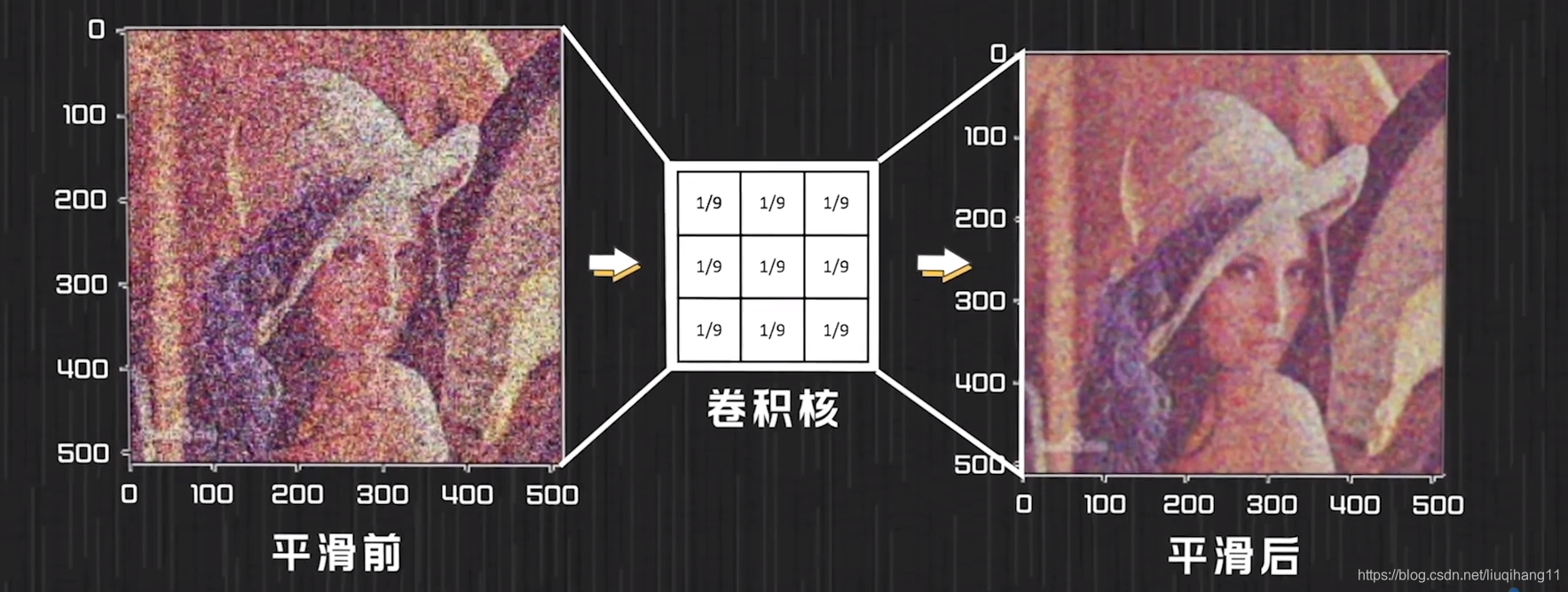我们可以认为卷积核是当前像素点对于周围像素点的一个试探。随着卷积核选择的不同,可以实现对图片中某些位置上像素点的过滤,以挑出图片的某些特征(将卷积核中的某些位置设置为0即可,此卷积核也被称为过滤器)或者衡量周围像素点对于当前像素点的影响(比如可以利用卷积核实现对像素点取平均的操作,此卷积核也被称为平滑卷积核,池化层也会用到)。图7给出了一个使用卷积核实现图片过滤的例子;图8给出了一个使用平滑卷积核对像素点取平均的实例。