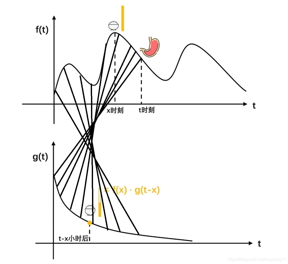 将两式相乘,即可得在x时间点进食某事物后,t时间点时肚子里该实物剩余的量f(x)g(t-x)