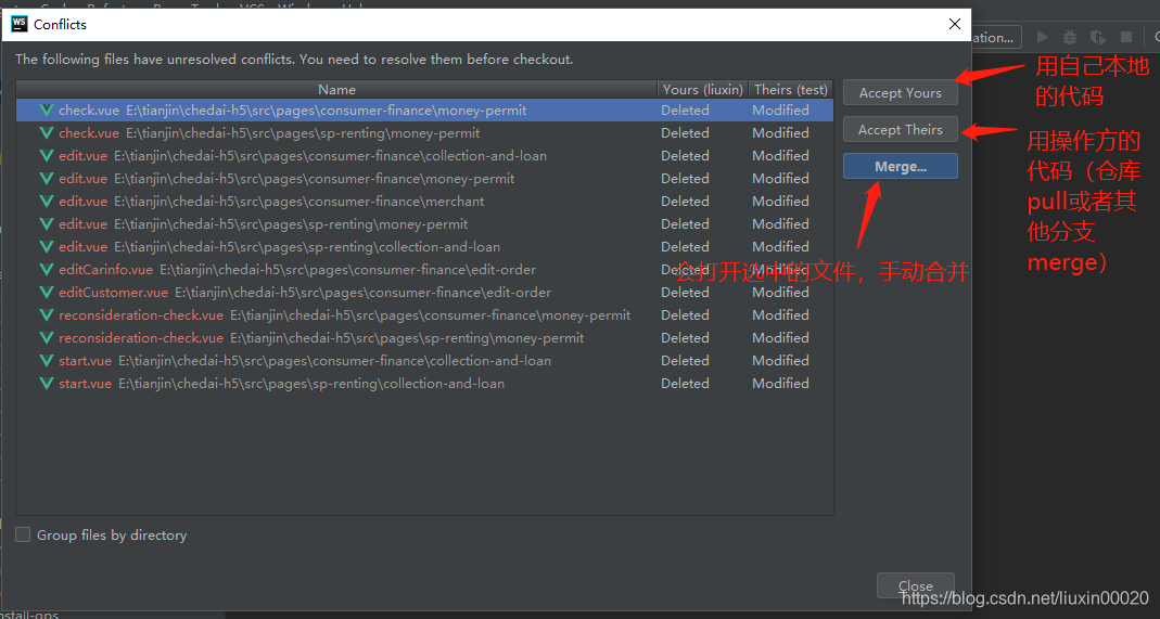 - 打开冲突视图之后,会展示所有冲突文件,如下: