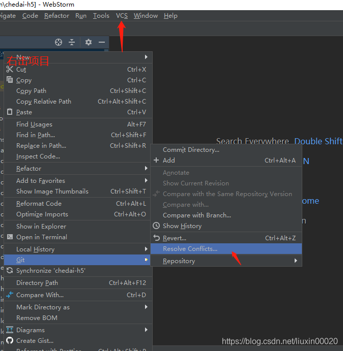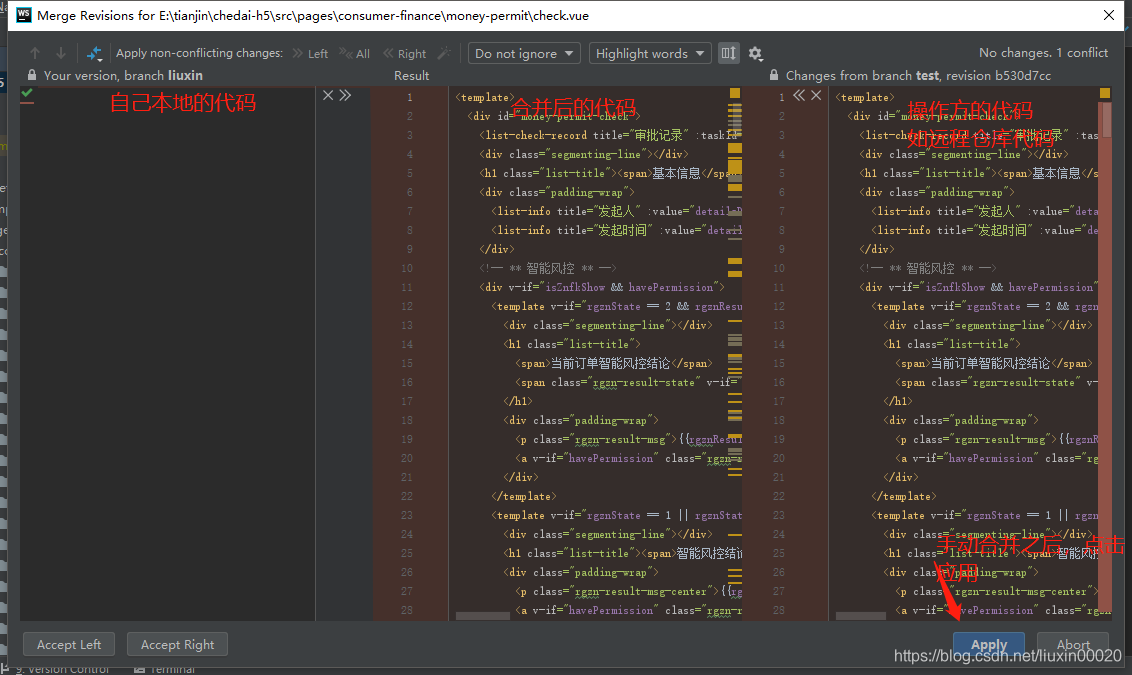 - 或者是打开conflict视图【右击项目(VCS)->git->resolve conflict】