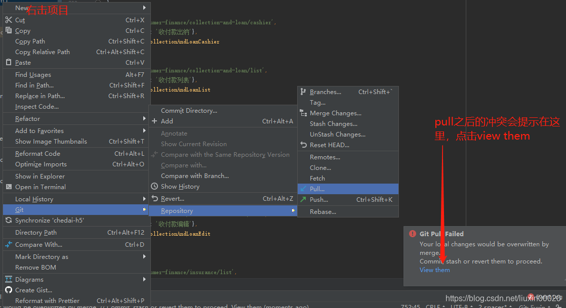 - 操作之后(如pull,merge),若有冲突,会有提示,直接点击view them打开冲突文件