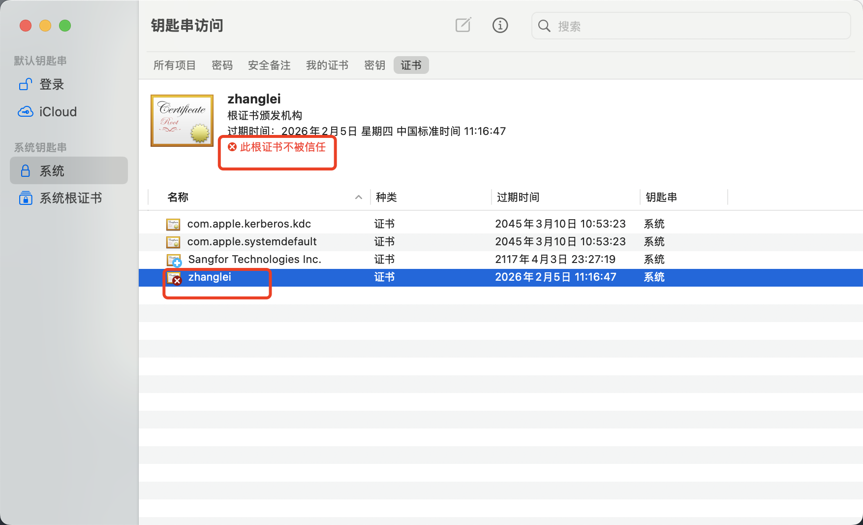 打开钥匙串 -> 系统 -> 证书,然后双击打开证书,选择始终信任。关闭此弹窗触发保存,输入密码即可。