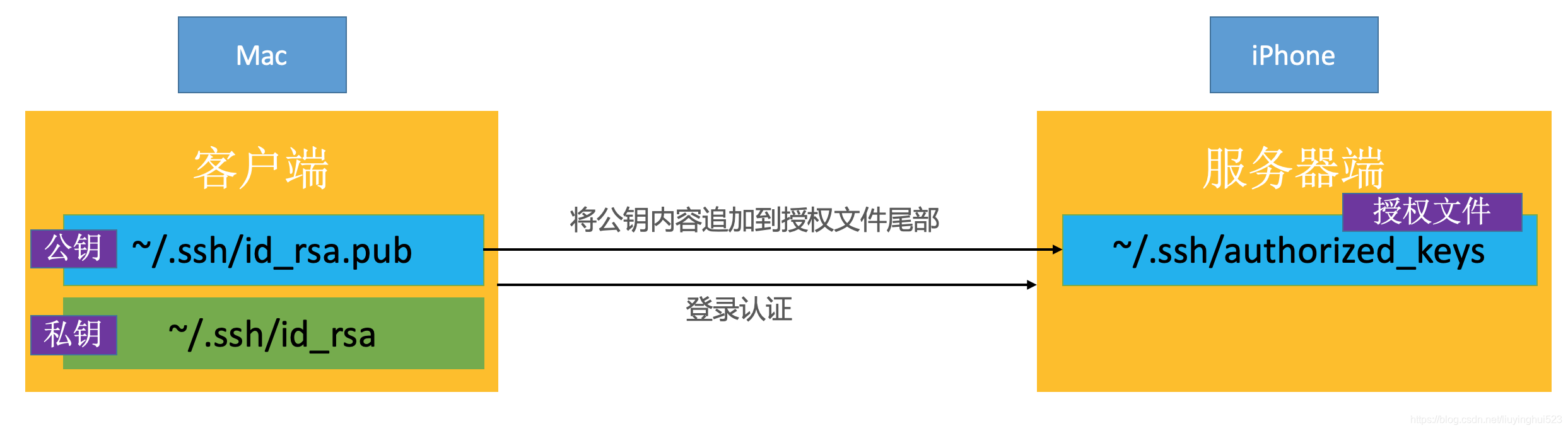 - ssh-copy-id会将客户端~/.ssh/id_rsa.pub的内容自动追加到服务器的~/.ssh/authorized_keys尾部