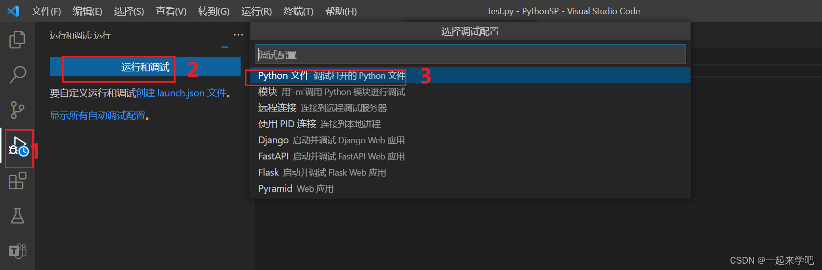 创建文件launch.json,然后点击左侧的运行和调试图标,点击“运行和调试”,选择“python文件 调试打开的python文件”