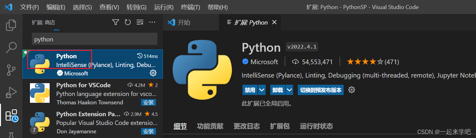 打开vs code,在扩展中搜索python,点击安装,安装完成后,重新启动一下vs code