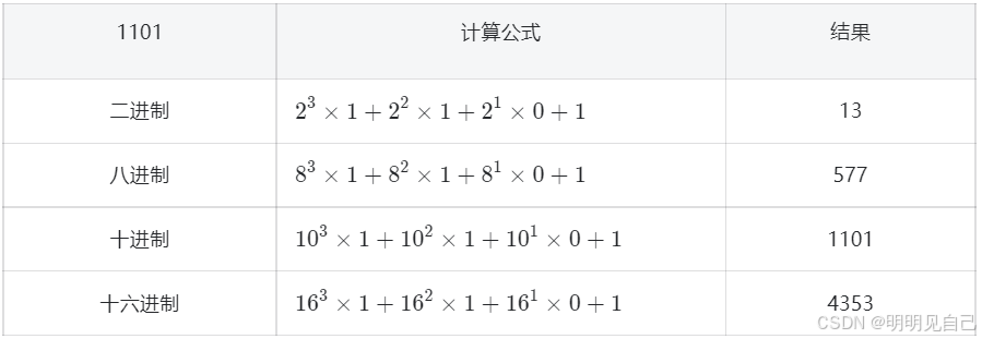 对于八进制、十进制、十六进制来说也是同样的原理,以1101为例,我们看一下每种进制的换算结果。