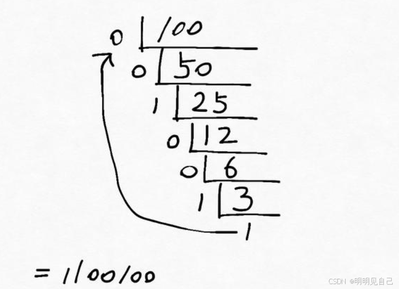 在网上找了一个十进制转换二进制的图片,用十进制的数去除2,一直到最后为1,然后从下到上列出余数,就是对应的二进制,那么为什么是这样的换算逻辑呢?