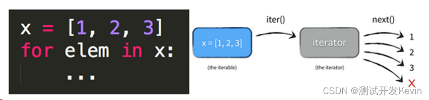 调用iter(容器对象,即可迭代对象,即上图中的x=[1,2,3])函数生成迭代器(如果调用成功)