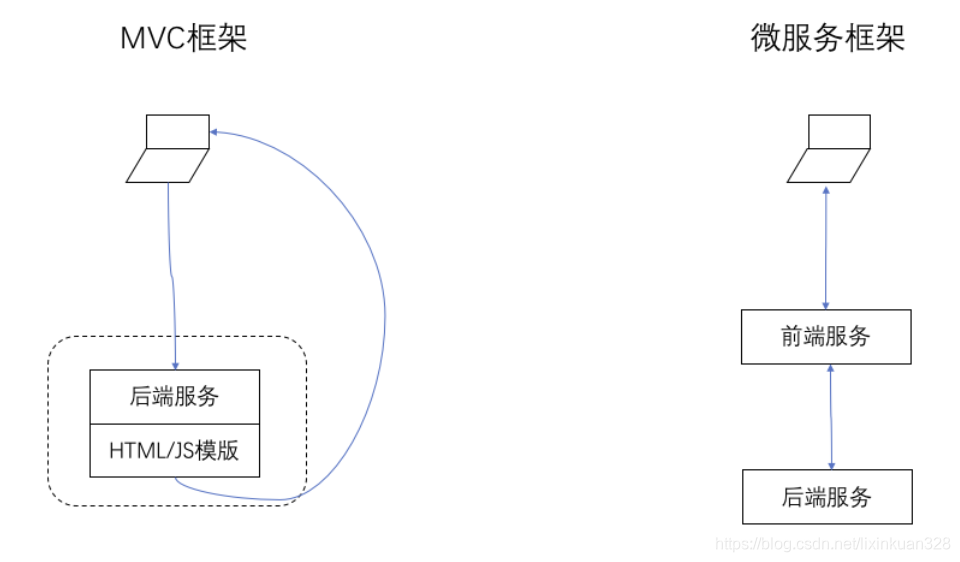 前端服务和后端服务都有独立的服务地址(IP+端口),请求先到达前端服务,然后前端服务再去后端服务请求需要渲染的元素和内容。