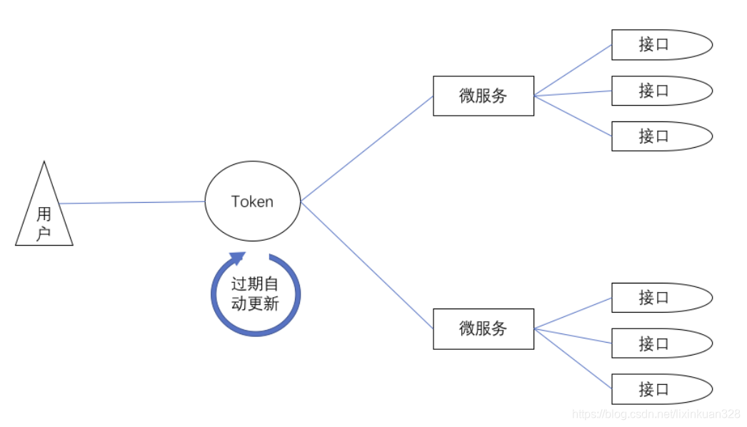 为用户生成一个单独的Token,即一长串字符串,Token和用户是一对一的关系,每个Token还对应多个微服务里面的多个接口,Token设置一定的过期时间,过期后自动更新。如下图所示,