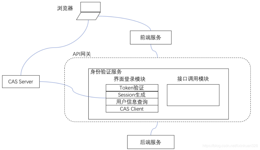 身份验证作为API网关里面的一个组件,可以以模块的方式运行,也可以以微服务的方式运行,这里我们推荐以微服务的方式运行。它包含了界面登录模块和接口调用验证模块。我们先说界面登录模块的架构设计。